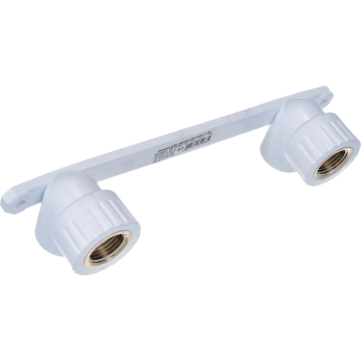 Конструктивно деталь представляет собой две угловые муфты-переходника (20 мм × 1/2") с углом 90°, закрепленные на монтажной планке для удобного крепления к стене. Подходит для скрытого монтажа и выдерживает температуру до 95°C при давлении до 20 бар